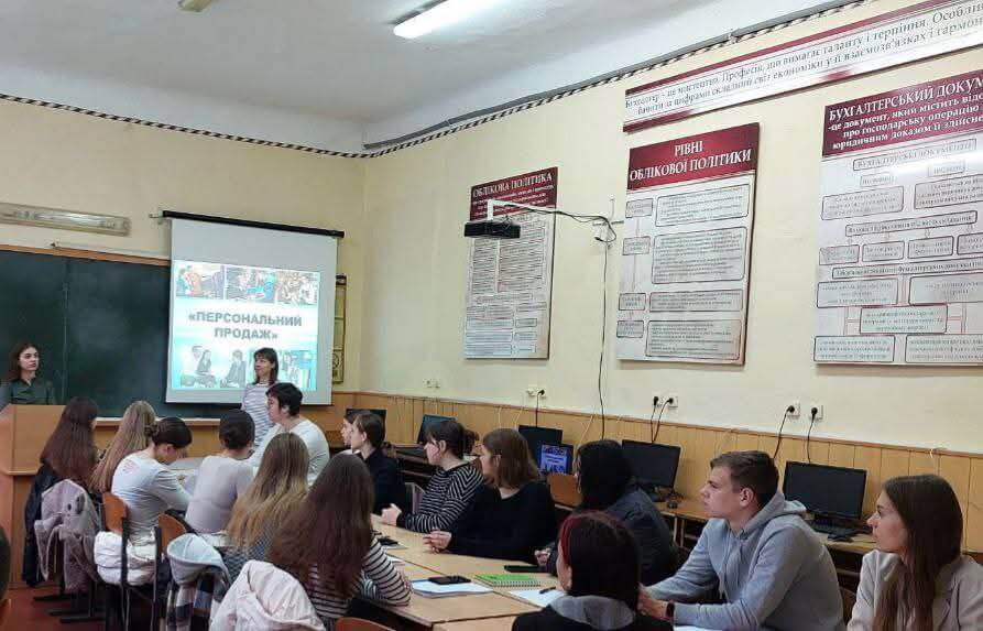 04 жовтня 2024 року викладач Тетяна Макогончук спільно Веронікою Колісніченко – продавецем-касиром мережі магазинів «Копійочка» проведена гостьова лекція для здобувачів освіти зі спеціальності 076 Підприємництво та торгівля. Лекторка ознайомила присутніх з технікою персонального продажу, змістовно з наведенням прикладів назвала етапи продажу різних груп товарів. Завдяки практичній спрямованості заняття студенти мали змогу засвоїти фахові навички, передбачені освітньо-професійною програмою «Комерційна діяльність».